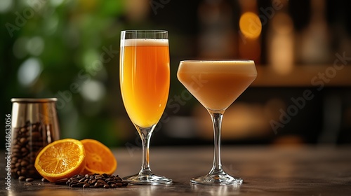 High-quality food photography with mimosa and creamy cocktail on dark bar background