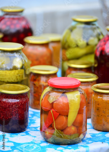 Home canned vegetables in the garden in summer