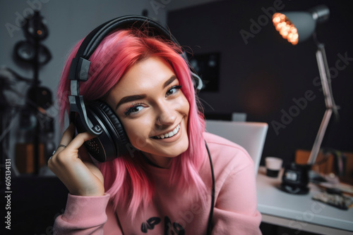 Influencer with earphones engaging vloggers with pink capturing life's moments through a computer laptop, people with social media and smart working concept