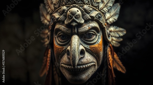 Intricate tribal-style ceremonial mask with exaggerated facial features and feathered headdress, evoking ancient mythology and spiritual symbolism.