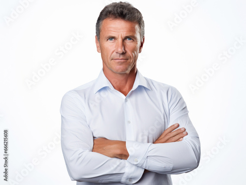 portrait, isolated, white, background, person, people, happy, face, attractive, studio, smile, 1, model, looking, cheerful, fashion, smiling, lifestyle, expression, happiness, standing, style, modern, posing, ai, caucasian, american, ethnic, mid-age, adult, middle-aged, male, man, business, businessman, shirt, casual attire, confident, man, arm, professional, photogenic, guy