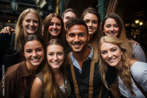Joyful group of festival-goers wearing lederhosen and dirndls, Generative AI