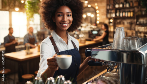 hot drink, cafes, barista, service, woman, drink, business, african american, cafeteria, cup, shop, eatery, apron, men at work, owner, female, happy, beverage, professional, occupation, holding, waitress, job, work, employee, uniform, staff, smiling, industry, mug, small business, cafes, professional occupation, coffee cup, workshop, caffeine, preparation, girl, cafes, entrepreneur, serving, waiter, retail, espresso, cappuccino, standing, bar
