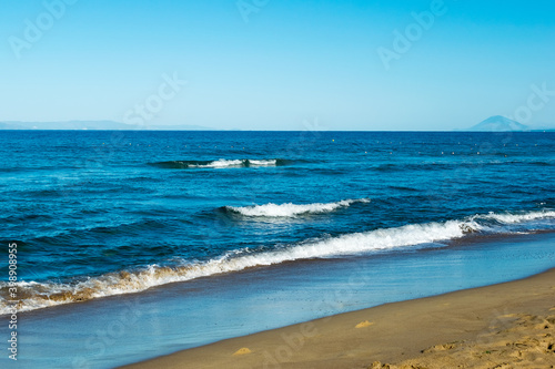 landscape with sea, waves, coast and mountains