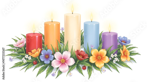 lit Advent candles in red, orange, cream, blue, and purple are nestled in green foliage and colorful flowers against a white background, suggesting a religious observance