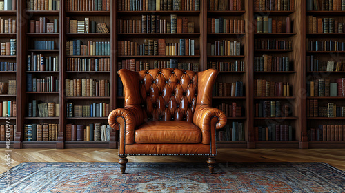 Luxurious tufted leather armchair in a wood-paneled library with books Harvest Time Mustard yellow rust orange deep brown olive green Anime/Manga Style