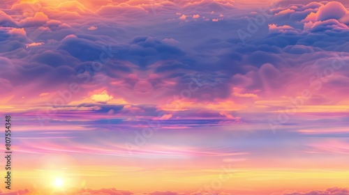 majestic sunrise panorama with the sun breaking through a layer of clouds, painting the sky with streaks of orange, pink, and purple