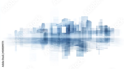 Minimalistic digital city skyline made of geometric squares with blue skyscrapers and reflections in water, set against a white background, symbolizing modern urban design and corporate architecture.