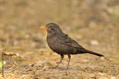 mirlo común posado en el suelo del parque (Turdus merula) Ojén Andalucía España