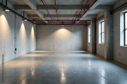 Modern empty industrial-style room with concrete walls, large windows, exposed ceiling pipes, and polished cement flooring