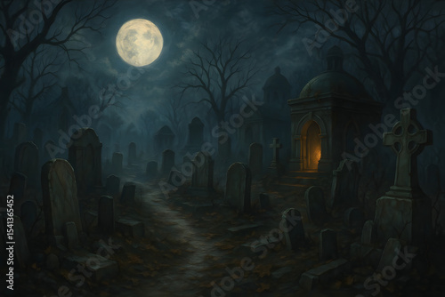 cemetery, cemetery, gravestone, headstone, crypt, mausoleum, grave, skittish, eerie, creepy, dark, night, horror, scarey, haunted, mysterious, gothic, atmospheric, moody, desolate, sombre, sinister, supernatural, paranormal, moon, path, tree, light, fog, mist, cloud, shadow, stone, cross, halloween, october, autumn, art, illustration, digital, painting, scene, old