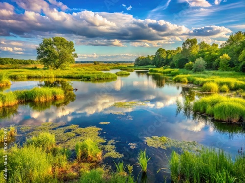 * Ottawa National Wildlife Refuge's marsh landscape features lush vegetation and distant trees reflected in the calm waters, exuding serenity.