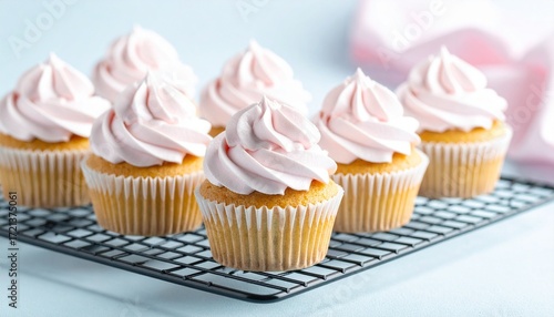 pale purple cupcakes with sprinkle on top are on rustic table, top view