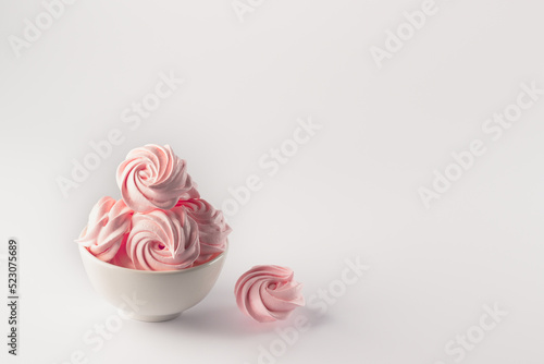 Pink fluffy meringues in a white bowl. Soft soufflé, pastel color. Pink marshmallows in a plate on a white background.