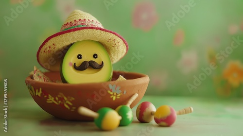 Playful Mexican Avocado with Sombrero and Mustache in Traditional Clay Bowl with Maracas for Festive and Cultural Content