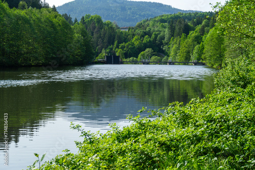 river, rain, water, stream, body of water, tree, wood, hike, vale, spring, plant, summer, grass, panorama, bavaria, german, leaf, tree trunk, bark, nature, waterway, fisheye, landscape, path, underbrush, orange, green, brown, earth, sky, cloudless