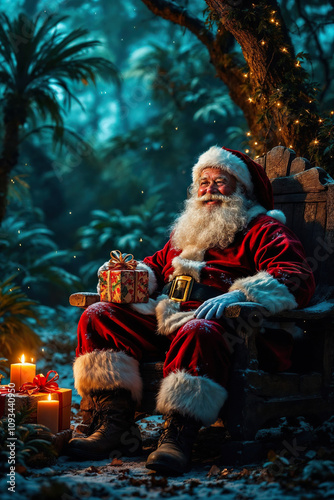 Santa Claus with Christmas Gift Sitting in a Festive Forest, Night Scene, Vertical Composition