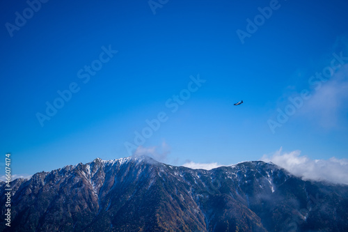 霞沢岳、乗鞍岳、上高地、穂高岳などを見るために、長野県松本市の晩秋の雪が積もる焼岳を登山する風景 Scenery of climbing Mt. Yakedake with snow in late autumn in Matsumoto, Nagano Prefecture to see Mt. Kasumisawa, Mt. Norikura, Kamikochi and Mt. Hodaka