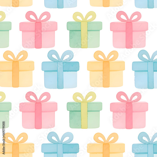 seamless, pattern, background, gift, box, present, watercolor, hand-painted, pastel, pink, blue, yellow, green, texture, wrapping paper, textile, fabric, holiday, birthday, celebration, festive, occasion, decorative, wrapping, cardboard box, print, cute, artistic, soft, charming, scrapbook, stationery, greeting card, wallpaper, repeat, repeatable, elegant, modern, minimal, party, anniversary, design element, craft, bricolage, transparent, cut-out