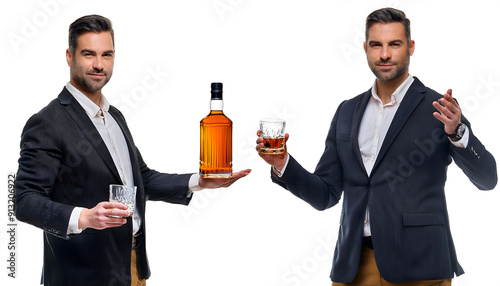 set isolated, man's hand with a glass of whiskey bottle