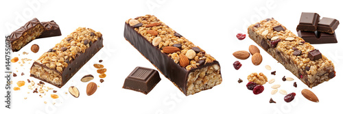 Set of A muesli chocolate bar with cereals isolated on a transparent background.