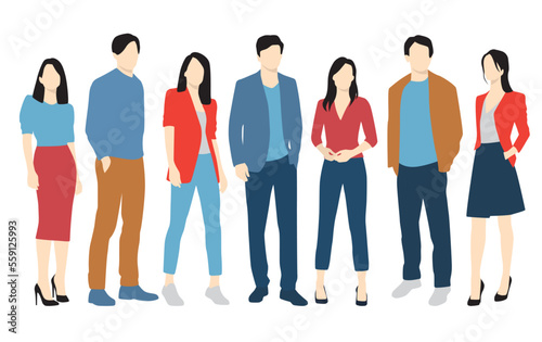 Set of young men and women, different colors, cartoon character, group of silhouettes of standing business people, students, the design concept of flat icon, isolated on white background