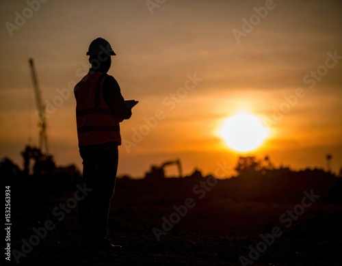 ** Silhouette of a construction worker using a tablet at sunset, with cranes and machinery in the background. **