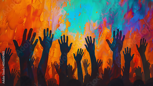 Silhouettes of raised hands against a vibrant, abstract backdrop symbolizing human rights and freedom