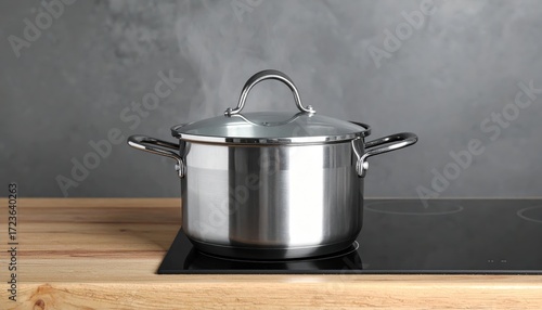 ** Sleek stainless steel pot with steam on an induction cooktop, set in a modern kitchen. Perfect for culinary and kitchen-themed projects. **