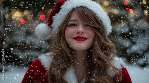 christmas, santa, woman, holiday, festive, snow, smile, happiness, red lips, make-up, winter, joy, beauty, cheerful, holiday spirit, realistic, celebration, portrait, seasonal, charming, vibrant, female, cosy