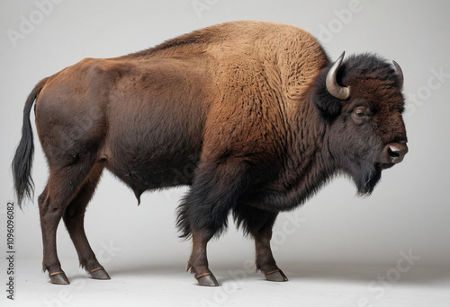 standard Bison right side view. Full figure visible, flat white background, no shadows, head and legs visible, ultra detailed, photorealistic 400mm lens, low angle
