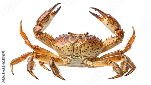 Studio macro photo of a crab standing upright with claws lifted, shell and legs illuminated from all sides, fully isolated on transparent white — sideways walker, armored scavenger.