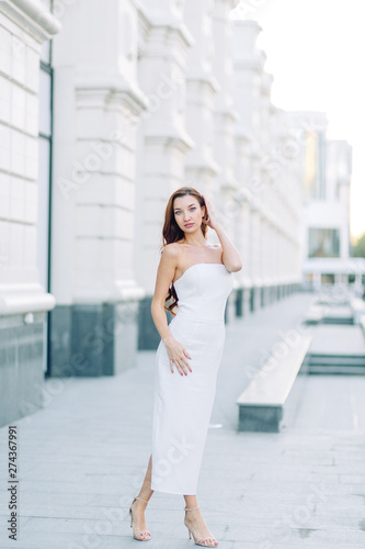 Summer look and white dress. Portraits of an elegant girl with luxury apartments.
