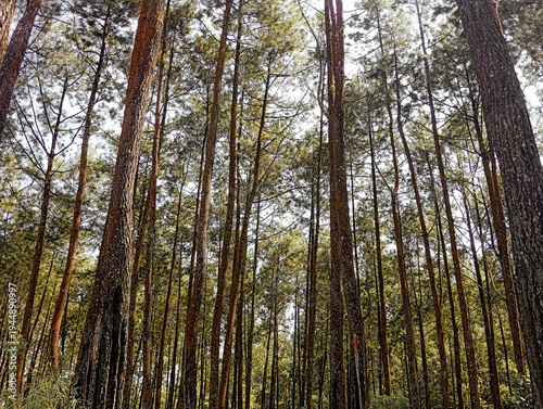 Tall pine trees rising toward the sky in a peaceful forest landscape with warm sunlight filtering through the branches, creating a natural and refreshing woodland atmosphere.