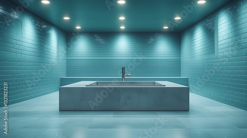 Teal Sanctuary A Minimalist Concrete Basin Bathed In Calming Aqua Light, Reflecting Tranquility In A Modern Spa Setting