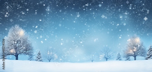 The abstract blue background, adorned with snow, creates a serene and festive winter wonderland.