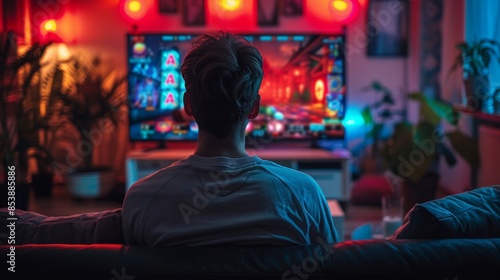 the future of gaming for the population with a young man sitting on the couch playing slots on his tv