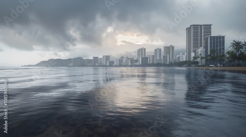 **: The Honolulu skyline with the ocean front on a cloudy day, the overcast sky adding a soft, muted tone to the cityscape and water.