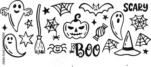 halloween, pumpkin, vector, set, bat, illustration, icon, cartoon, autumn, ghost, cat, holiday, spider, design, sorcerer, horror, symbol, silhouette, hat, skull, art, black, skittish, october, moon