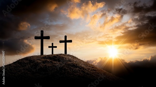three crosses on top of a hill at sunset, with the sky in the background filled with clouds and the sun setting in the distance