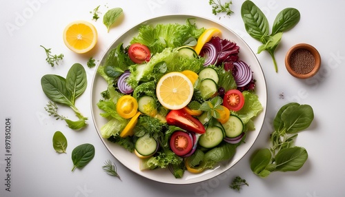 Top view of a vibrant salad with leafy greens, colorful vegetables, and a squeeze of lemon