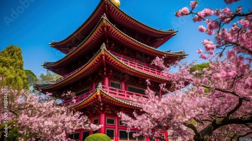 traditional japanese pagoda with blossoming cherry trees. Generative AI