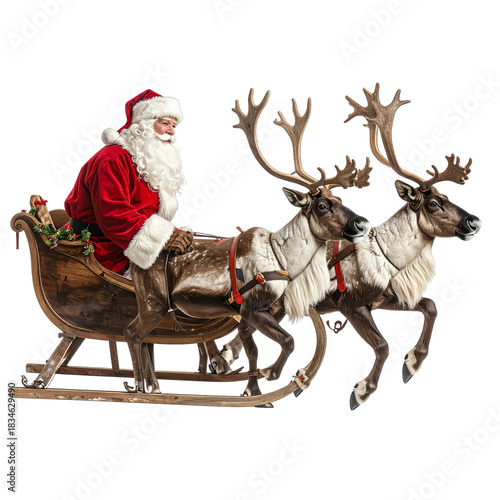 Traditional Santa Claus on Sleigh with Reindeer, Full Side View, Isolated on Transparent Background