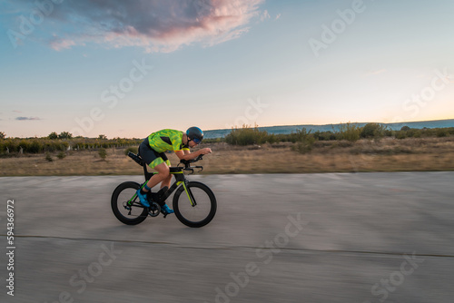 Triathlete riding his bicycle during sunset, preparing for a marathon. The warm colors of the sky provide a beautiful backdrop for his determined and focused effort.