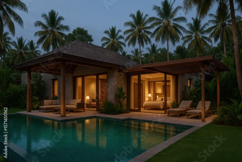 villa, tropical, luxury, twilight, infinity pool, wood, glasses, stone, modern, warm, evening, architecture, palm, greenery, serene, resort, lighting, vacation, tranquil, peaceful, design, private, exclusive, bungalow, photorealistic, comfort, environmentally friendly, night scene, scenic, paradise, lush, nature, foliage, decking, canopy, retreat, poolside, cosy, elegant, lifestyle, contemporary, view, privacy