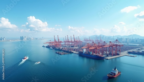 maritime, industrial, transportation, harbor, boat, commercial, industry, dock, shipping, ship, infrastructure, trade, water, port, blue skies, crane, city landscape, urban