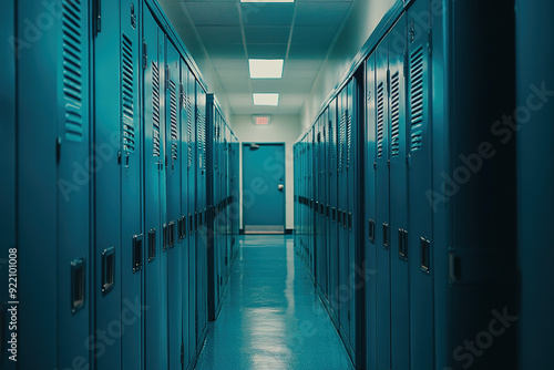Vibrant School Lockers in Blue and Teal, Featured in a Cinematic Wide-Angle Hallway View with Warm Lighting and Contemporary Design.