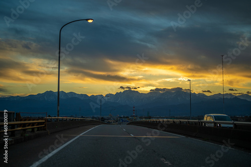 富山県富山市の道路から朝焼けの剱岳や立山を見る風景 View of Tsurugidake and Tateyama in the morning sun from the road in Toyama City, Toyama Prefecture, Japan.