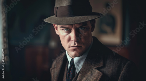 Vintage Detective Portrait: Intense Expression, Retro Fashion, Classic Fedora Hat, Cinematic Lighting, 1940s Noir Style Character Study.