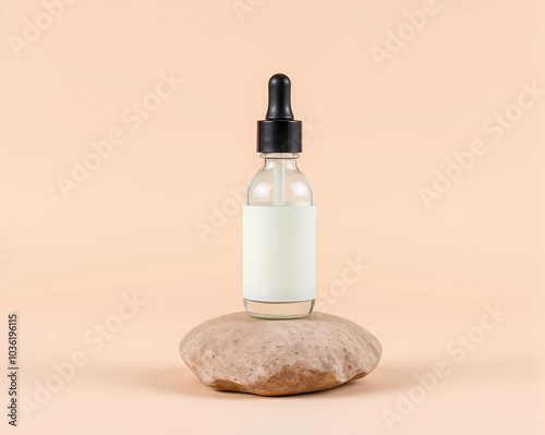 White liquid serum in a glass dropper bottle on a natural stone stand, complemented by a beige backdrop for a spa feel, generative ai